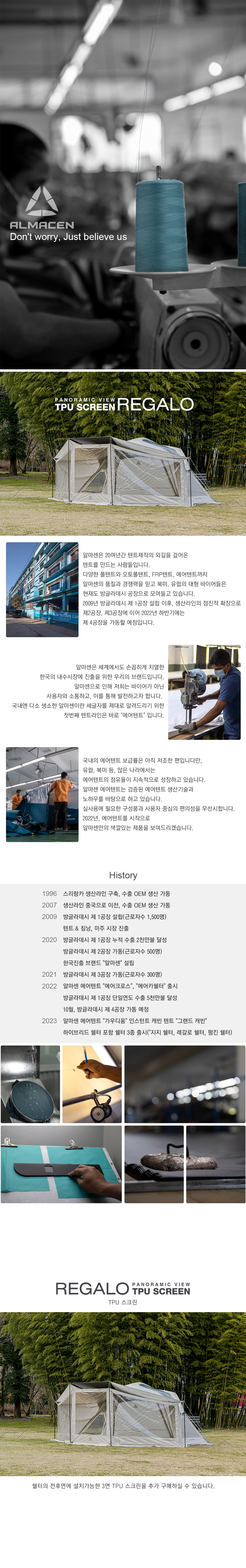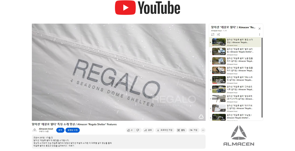 알마센 유튜브 채널을 통해 알마센 레갈로 TPU 스크린과레갈로 쉘터 관련 동영상을 모두 시청하실 수 있습니다.