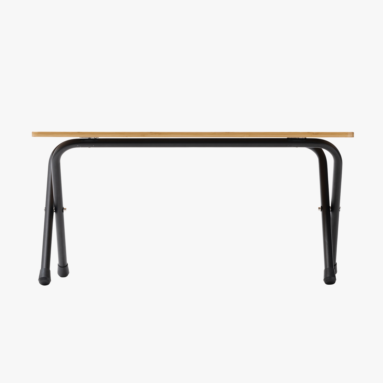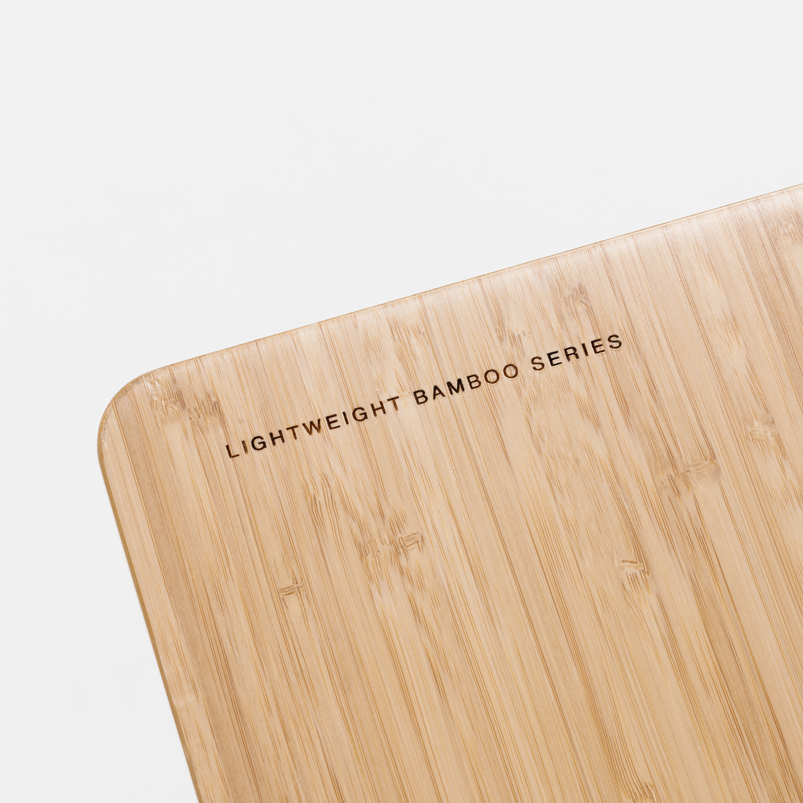 선반, 테이블 때로는 벤치와 다양하게 사용할 수 있는 "폴딩쉘프"라인이 Light Bamboo 시리즈에 새롭게 추가되었습니다. 레귤러 사이즈는 지상 높이 38.5cm의 대나무 상판형 선반입니다. 차 트렁크에도 그대로 들어가는 사이즈로 공간 활용이 용이합니다. 테이블 윗면에 Light Bamboo를 각인하고 다리에 흑색 알루마이트 가공을 처리했습니다.