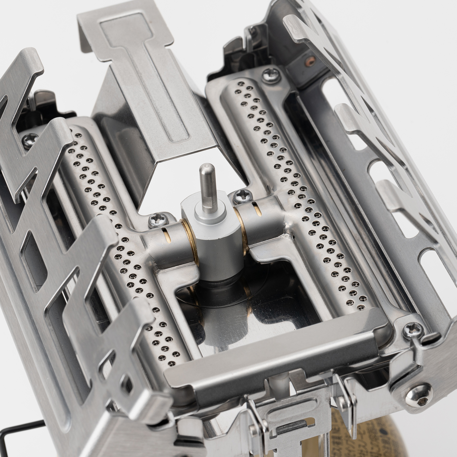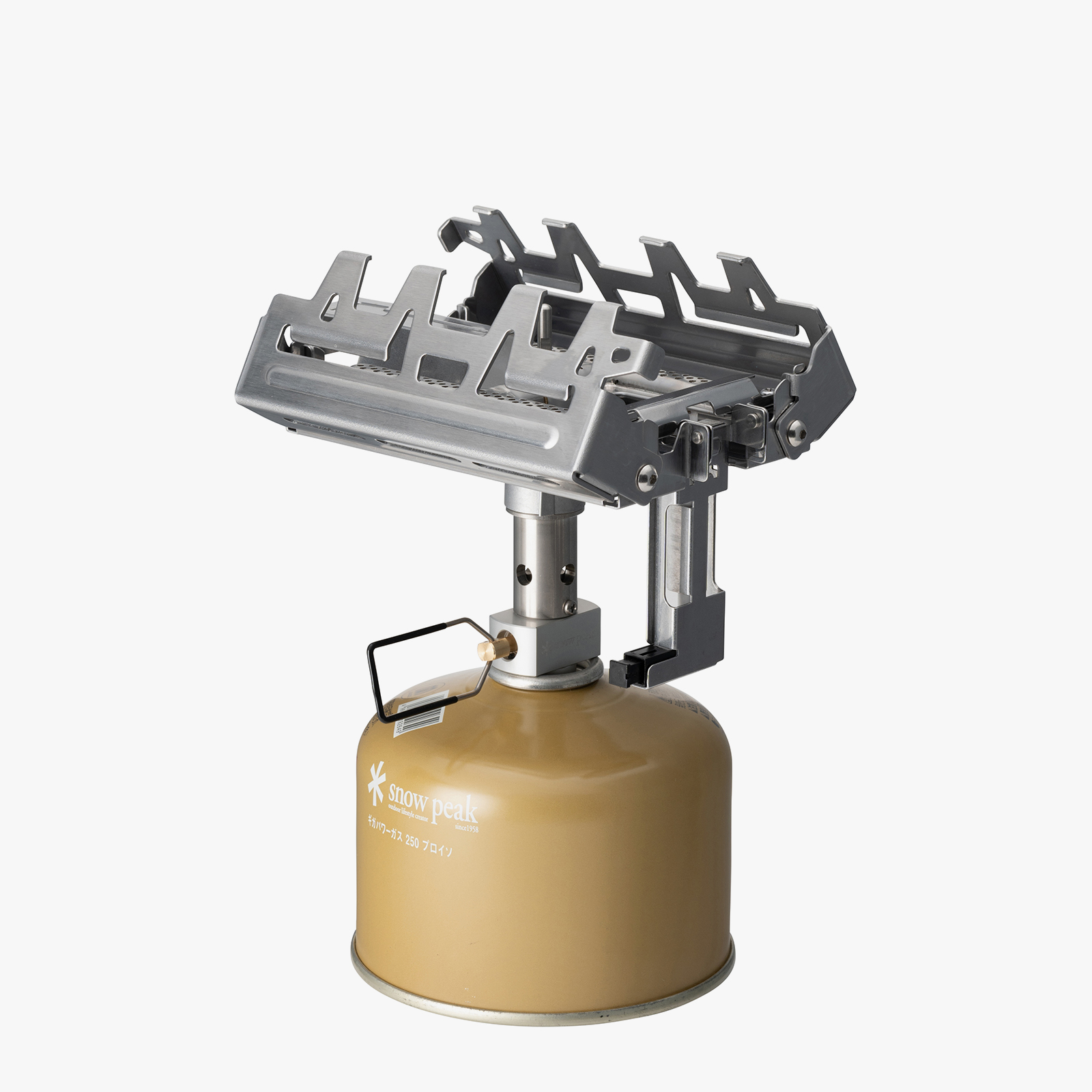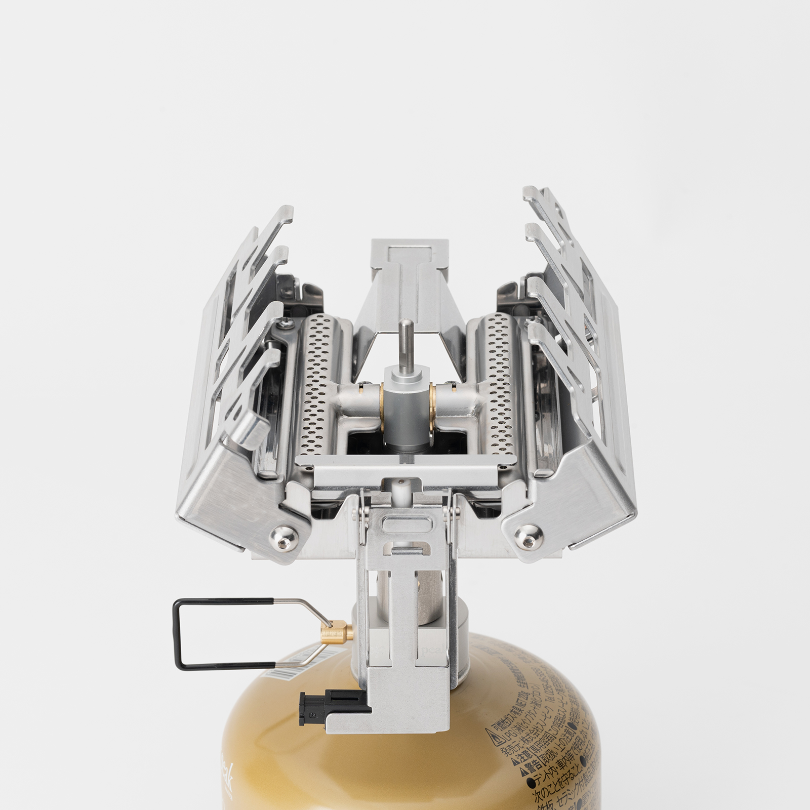 기구 마개, 혼합관이 버너 헤드 안에 들어가 직사각형 모양으로 컴팩트하게 접을 수 있는 컴팩트 스토브. 화구는 원형이 아닌 H자형의 형상으로, 부분적이지 않고, 넓은 면적에 열을 전달할 수 있기 때문에, 「트라메지노」나 「야엔 쿠커」와 같은 폭이 넓은 조리 기구에 대해서도 열을 효율적으로 잘 전달합니다. 면적도 한층 더 넓기 때문에, 안정감도 좋습니다.