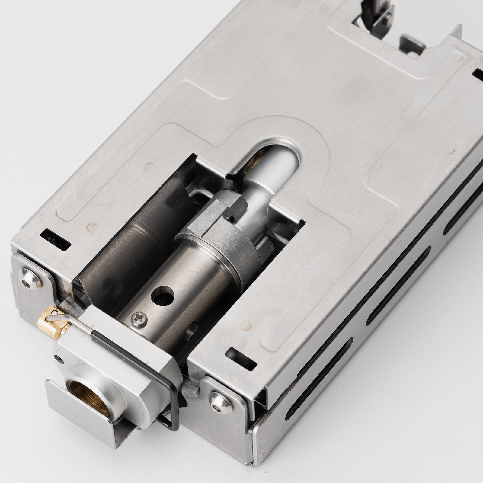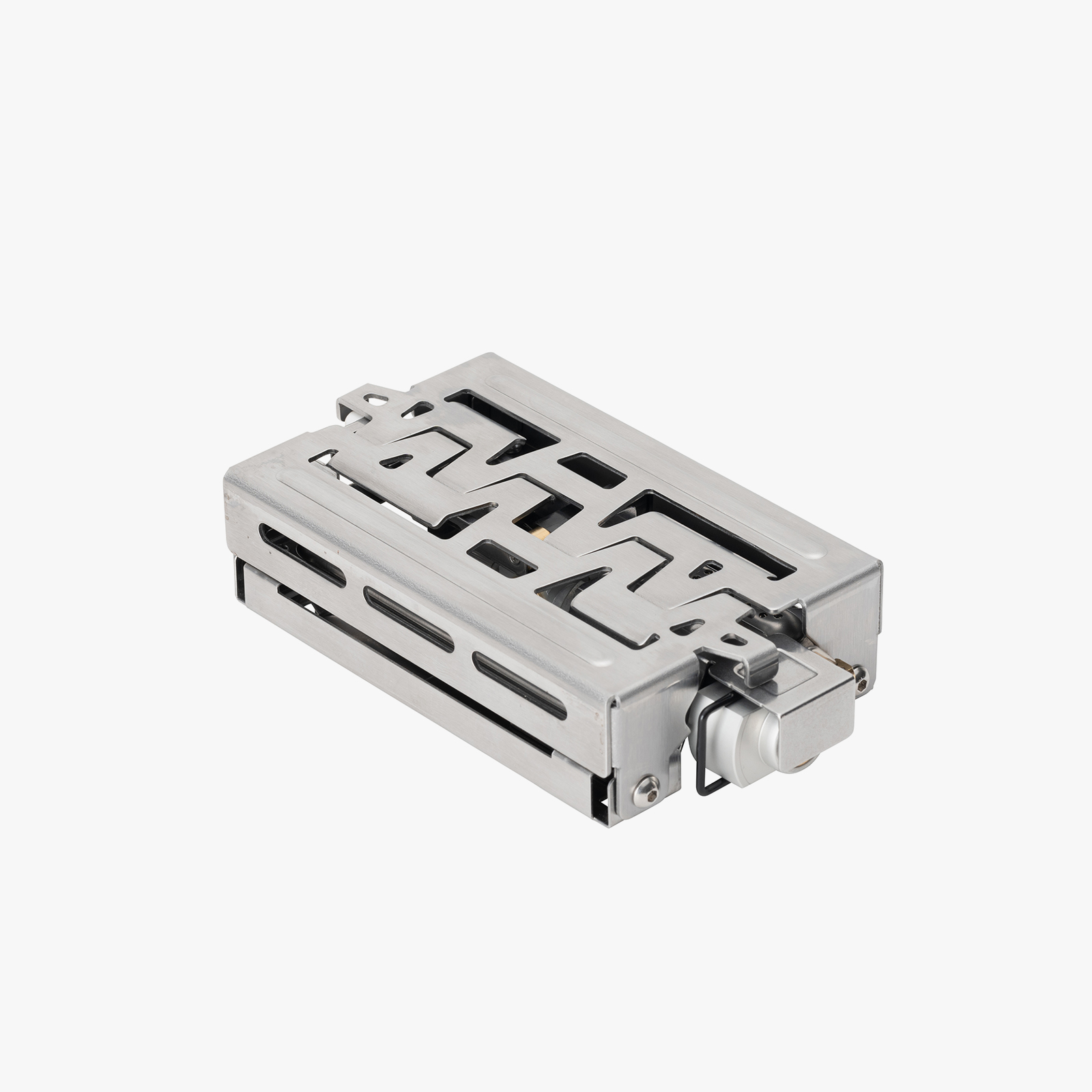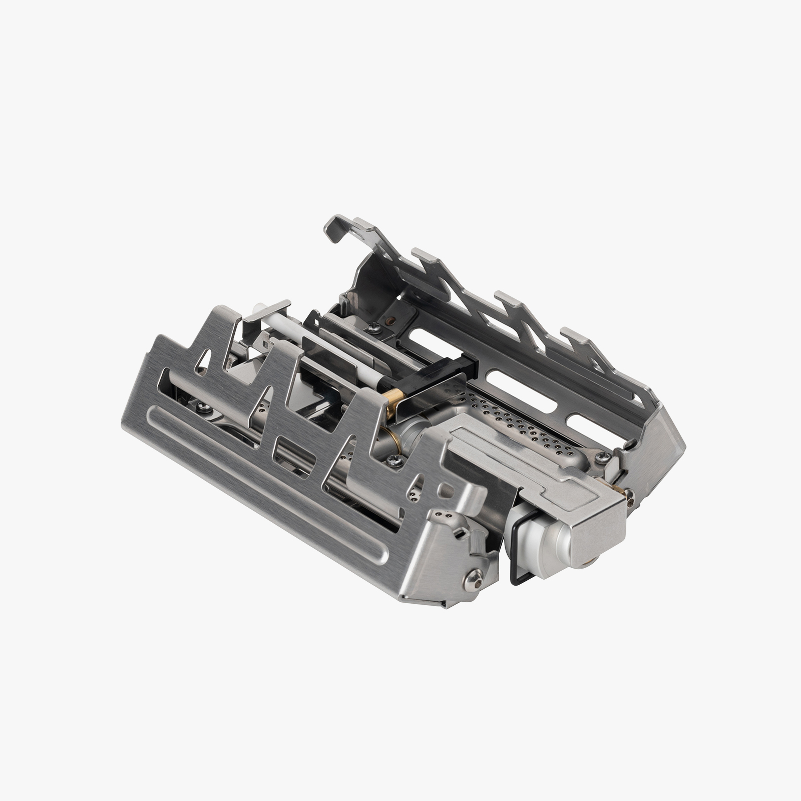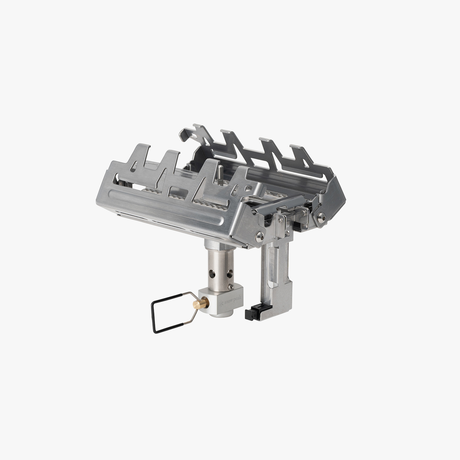 기구 마개, 혼합관이 버너 헤드 안에 들어가 직사각형 모양으로 컴팩트하게 접을 수 있는 컴팩트 스토브. 화구는 원형이 아닌 H자형의 형상으로, 부분적이지 않고, 넓은 면적에 열을 전달할 수 있기 때문에, 「트라메지노」나 「야엔 쿠커」와 같은 폭이 넓은 조리 기구에 대해서도 열을 효율적으로 잘 전달합니다. 면적도 한층 더 넓기 때문에, 안정감도 좋습니다.