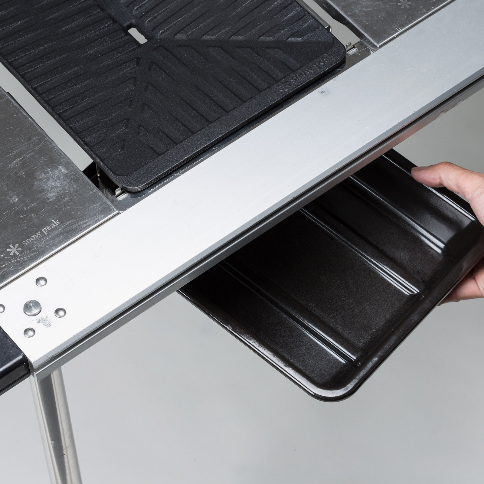 판+망이 아닌 [주철] 그리들을 직접 열을 줍니다. 물론 불필요한 기름은 물접시로 떨어지도록 설계하여 연기의 발생을 최소화했습니다. 그리고 캠퍼의 고민거리인 망의 세척의 부담도 크게 줄여줍니다.