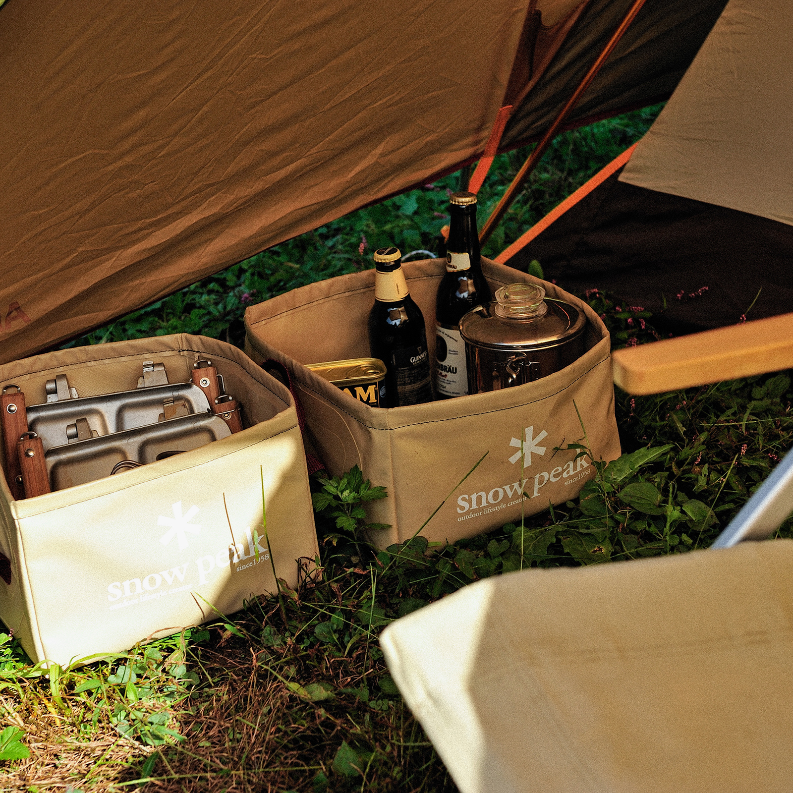캠핑 사이트의 정리정돈에 활용할 수 있습니다. 작게 접을 수 있어 어디에나 넣을 수 있으며 물 뿐만 아니라 키가 큰 병류의 휴대에도 편리합니다.